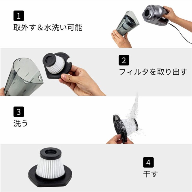 【便利と使いやすい?】?車の真空の電源コードをDC 12Vのシガレットライターに接続し、指先でボタンをオンとオフを切り替え、車を清掃する際にハンドヘルド真空の機能がある軽い設計をお楽しみください。着脱式のダスクビンは取外/取付簡単で、車内で使用後フィルターと一緒に水洗いして乾かせば集塵効果の劣化はありません。