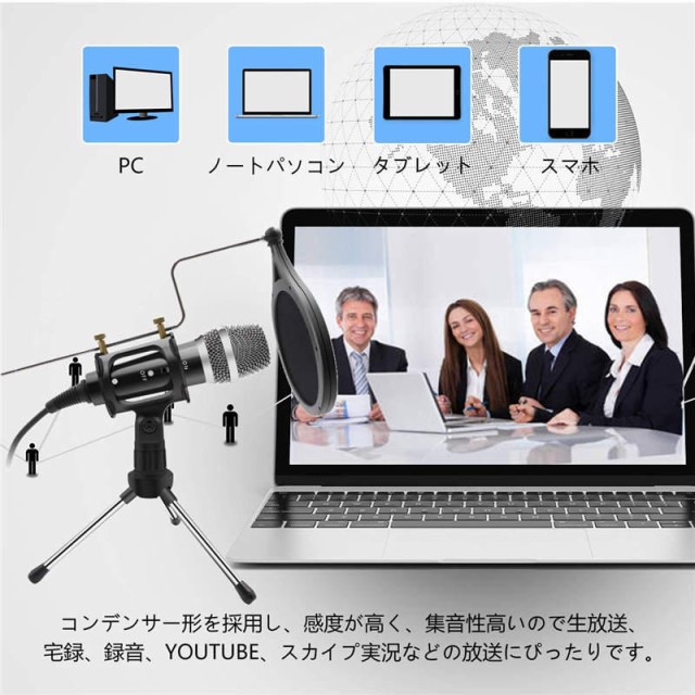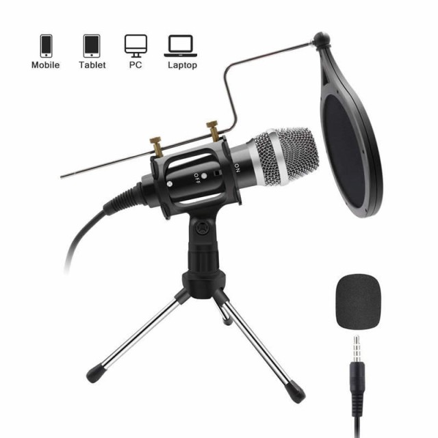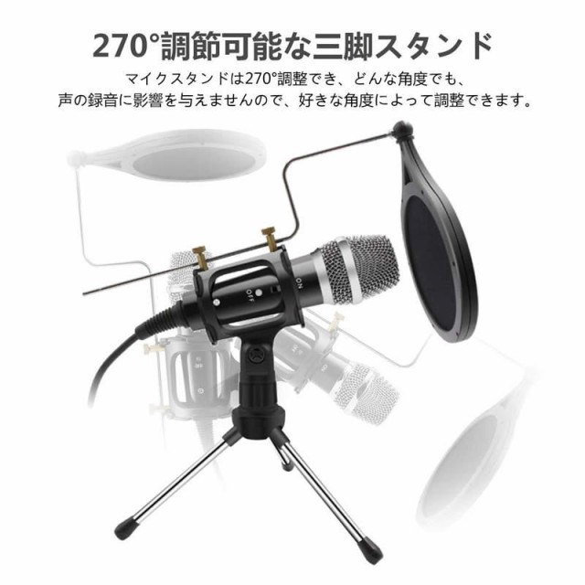 コンデンサーマイク 卓上マイク PCマイク マイクスタンド PCボーカル用 単指向性 三脚スタンド付き 折り畳み式 270℃調整可能