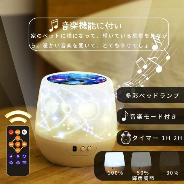 【最新版リモコン式&タイマー機能付き】本体を簡単に操作することができます(電源on/off、音楽on/off、点灯モード切り替え、ライトの明るさ調整、LEDランプの回転も操作可能)、リモコンは前の操作だけではなく、時限機能もあって、設定がとても便利です。また、タイマー機能が付くので、必要によって自動的に時間を1Hまたは2Hに設定できます。