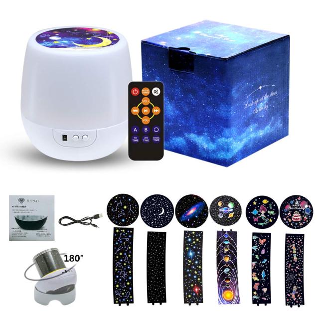 このライトはスタープロジェクター・ベッドサイドランプ・照明ライトなど一体多役の魅力があり! または、音楽再生の機能をもっており、18曲選択可能の高品質オルゴールです。6セット投影画像フィルムが付き、5色可調節カラフルな投影モード、360度回転と自動タイマー機能も付いており、家庭用プラネタリウムは、自宅にいながら星空を眺められるのが魅力! 満点の星空を見ることで癒されるという声が多いほか、ロマンチックな雰囲気を作りに役立つことから、世代性別問わず人気の高いアイテムです。