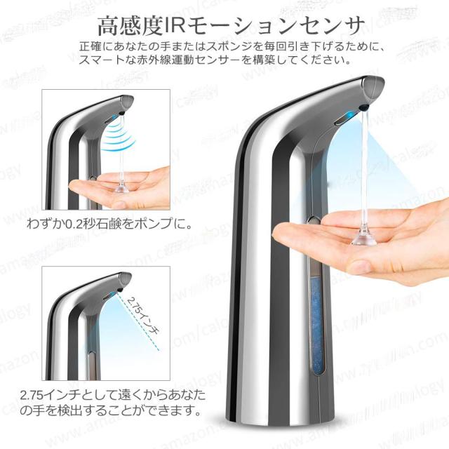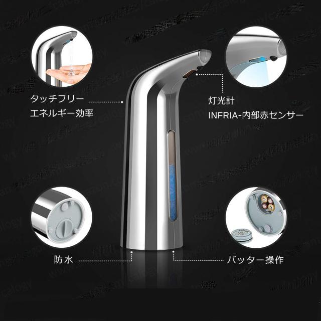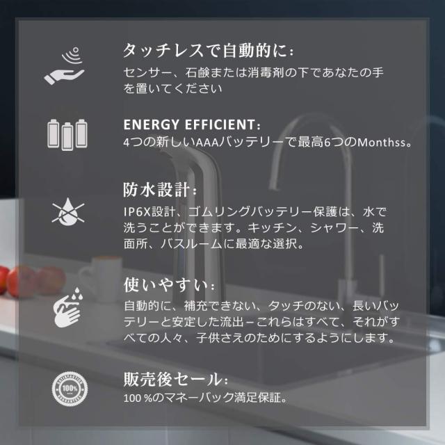 安定性を増すために底に滑り止めシリコーンを使用したIPX6防水仕様。電池を入れるときに使えるので、面倒な配線は不要です。単4電池4本(別売)を使用しており、どこにでも設置できます。手指消毒剤や食器洗い洗剤として使用しています。一回量は1mlです。あなたがより多くの石鹸が欲しいならば、再び排水するために2秒間センサーの下にそれを置いてください。それは手を汚さないのでそれは家、学校、病院、ホテル、コンサートホール、オフィスなどのような公共の場所での使用に理想的です。