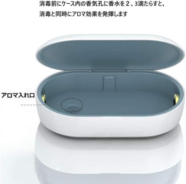 【アロマ効果】更に、消毒前にケース内の香気孔に香水を2、3滴たらすと、消毒と同時にアロマ効果を発揮します。アロマテラピー機能が付きのこのワイヤレス充電&消毒ケースが一台三役!