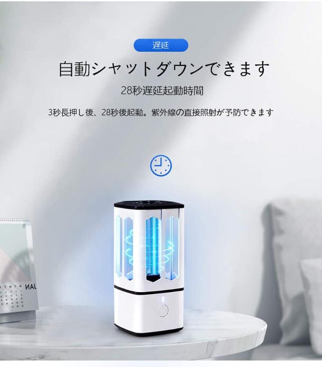 消毒30分間で自動シャットダウン、消毒したい空間で自由に簡単で消毒できます。3秒長押し後、28秒の遅延起動機能がありますので、紫外線の直接照射も予防できます。