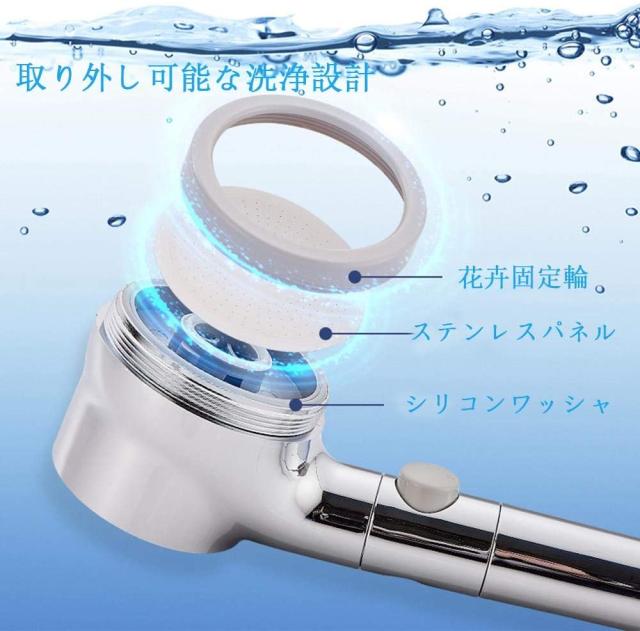【3タイプの水量制御]】3つのシャワーモード(レイン/ジェット/パルス)は気分に応じて自由に切り替えられます。?レインモード:圧力を緩めて、疲労を流し、顔を洗うことに適した水圧、敏感肌や赤ちゃんの肌にも優しい水流です。?ジェットモード:水圧があり、運動後や就寝前のシャワーに最適です。?パルスモード:超微細でまっすぐな水の流れは頭皮の汚れを除去し、汗や皮脂の詰まった毛穴などの汚れをしっかり取り除きます。必要に応じてモードを選択できます。