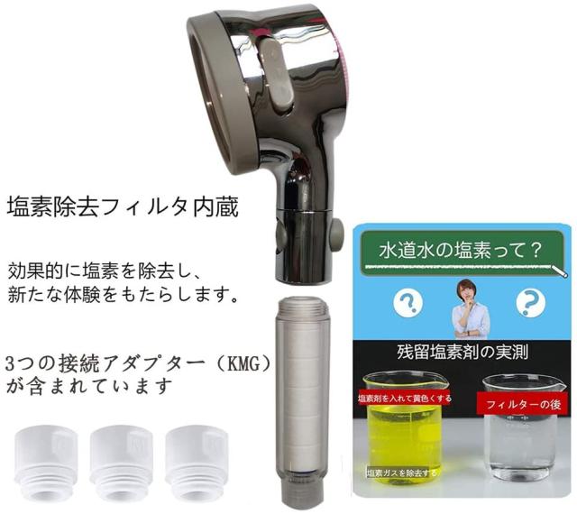 【便利なストップ機能】 シャワーヘッドの真ん中の部分に水流をストップボタンがあり、手元のボタンでシャワーの出し止めが簡単にできます。それに、止水時のウォーターハンマー現象を緩和し、過度な水圧をかけないようにする、安心してご使用いただけます。また、目を閉じたままでも操作できる、止水通水が自由自在、お湯を無駄にしません。【取り付け方法&内容物】●国際汎用基準G1/2インターフェース通用デザインで、ご家庭のほとんどのシャワーに取り付け可能です。パッケージには3つの接続アダプター(KMG)が含まれています。工具不要なのでとっても簡単。品質のいいアフターサービスは一年間の品質保証サービスを提供します。