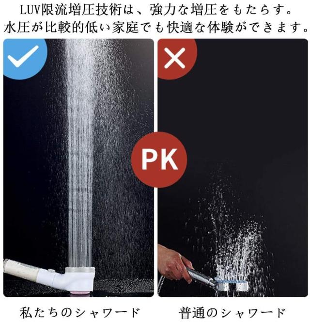 【驚きな節水機能】ノズルの部分は節水できるLUV技術を採用しており、 従来のシャワーヘッドと比べて、少ない水量でも同等の使用感が得られます。水道代はもちろん、同時に電気代やガス代も節約できます。通常水流によくあるハネ返り、刺激の強い肌当たりを抑えた、高速でありながらも穏やかな水流を実現し、赤ちゃんにも安心です。