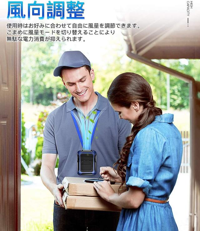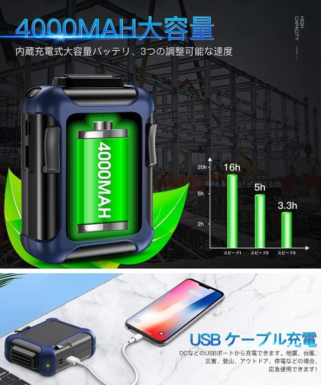 ?風量3段階調節可能:風量は強、中、弱の3段階で調節可能です。使用時はお好みに合わせて自由に風量を調節できます。こまめに風量モードを切り替えることにより無駄な電力消費が抑えられます。 フル充電時で最大約16時間の連続動作が可能です。弱/16時間、中/5時間、強/3.3時間。