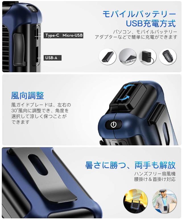 ?広い使用範囲:コンパクトなのに強力な風量を実現。アウトドア運動者(釣り好き、ハイキング、登山、工事現場、厨房、農作業、野外作業、工場内、倉庫)いろいろな場所で持ち運び便利ご使用できます。パッケージ内容:USB腰掛け携帯扇風機x1、日本語説明書x1、USB専用充電ケーブルx1