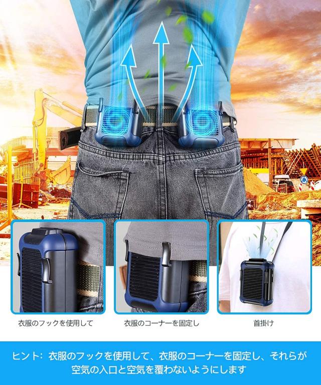 ?大容量バッテリー4000mAh:ファンから取り入れた空気を身体と服の間に流して、涼しく快適な環境にします。体のクリップ部分をズボンのベルトに引っ掛けるだけ!ファンから取り入れた空気を体と服の間に流して涼しくしてくれるジェットファンです!