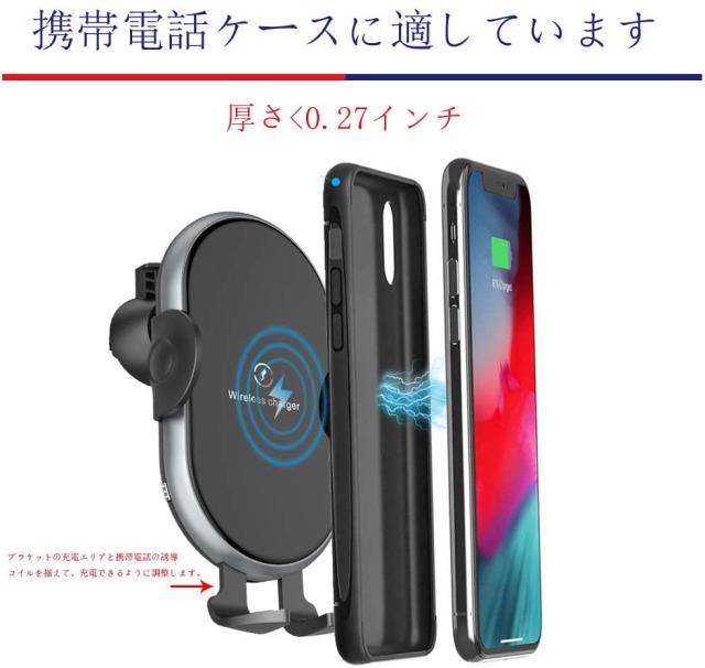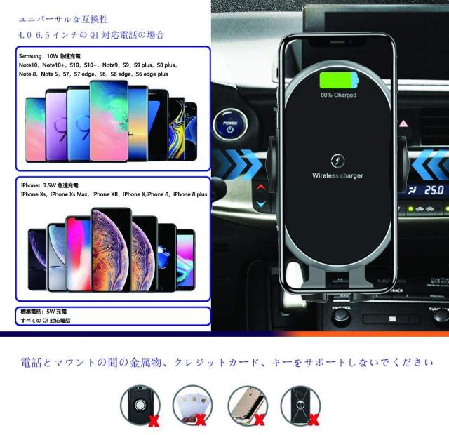 【車載Qi ワイヤレス充電器】10W/7.5Wの急速充電と5Wの標準充電に対応。充電スピードと効率は高くなり、電力転換率は80%以上に達します。7.5W規格はiPhoneに適用し、10W規格はSumsungや他のQi対応機種に適用します。スマホをホルダーに置くだけで急速に充電、これからはスマホの充電切れ、バッテリー不足の心配から解放されます。急速充電の場合にはQC2.0/QC3.0 USBカーチャージャーを利用する必要があります(パッケージに含まれています)