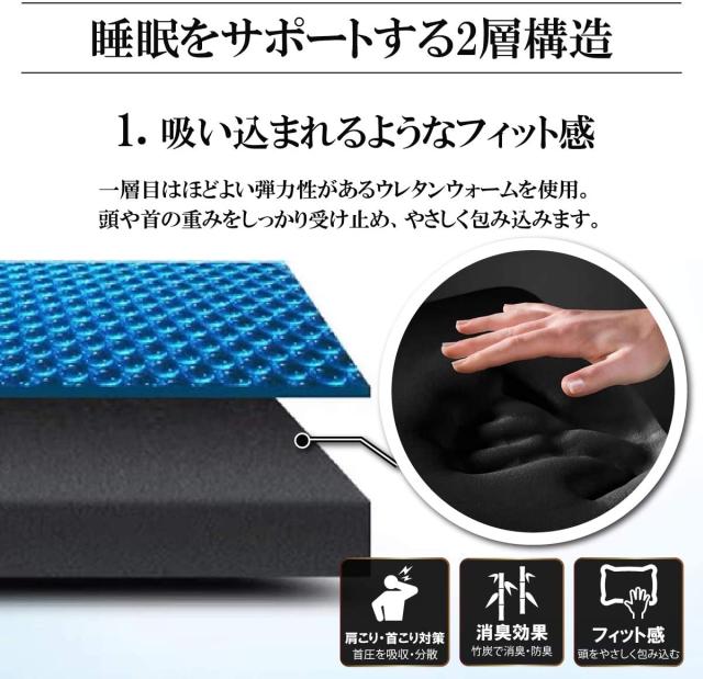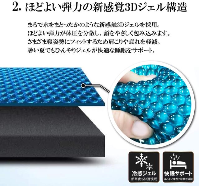【体圧分散・ 通気蒸れにくい・圧倒的な柔らかさ 】:脅威の弾力性能を持つTPEジェル素材を採用しており、圧力がかかると素早く跳ね返り、形状に合わせてぴったりフィット。また、TPE部分がハニカム構造のため、通気性がよくムレにくい!POINT3は柔らかいジェル素材が、頭を優しく包みこみ独特な感触が心地よくフィットし快適な寝心地にしてくれます。