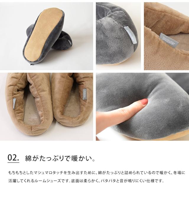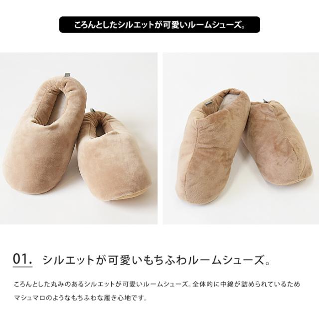 ころんとした丸みのあるシルエットが可愛いルームシューズ。全体的に中綿が詰められているためマシュマロのようなもちふわな履き心地です。もちもちとしたマシュマロタッチを生み出すために、綿がたっぷりと詰められているので暖かく、冬場に活躍してくれるルームシューズです。底面は柔らかく、パタパタと音が鳴りにくい仕様です。