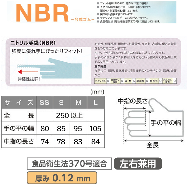 SSサイズ:厚さ0.12mm/全長250mm/手の平の幅80mm/中指長さ74mm