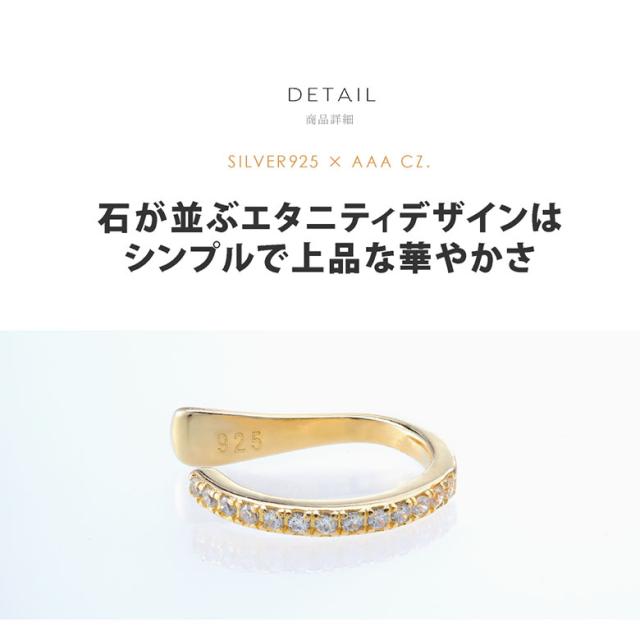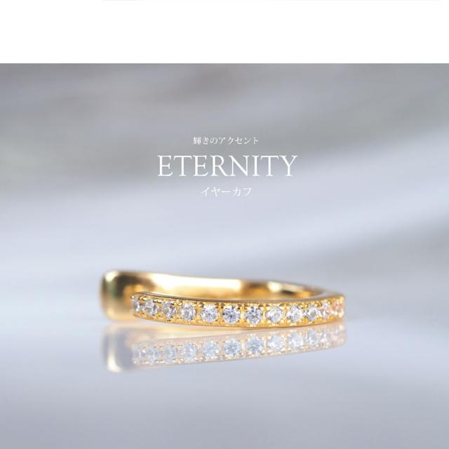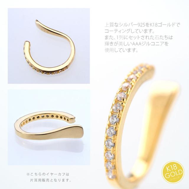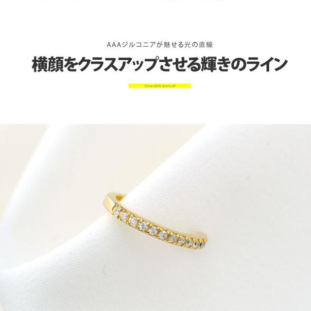 石が1列に並ぶエタニティデザインのシンプルで上品なイヤーカフです。横顔をクラスアップさせるキラキラの石のラインにはAAAジルコニアを使用。シルバー925をK18コート、ロジウムコートをかけているので、アレルギーや変色の心配も少ない使いやすいアイテムです。