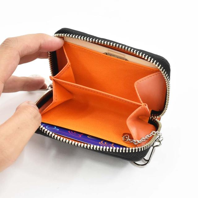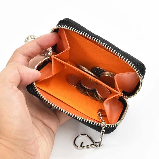 内部は仕切りで2部屋に分かれており、小銭や鍵の収納が可能。三つ折りにすれば紙幣も入ります。また、両脇にはカードポケットも装備しており、 これ1つで外出できる機能的コインケースです。