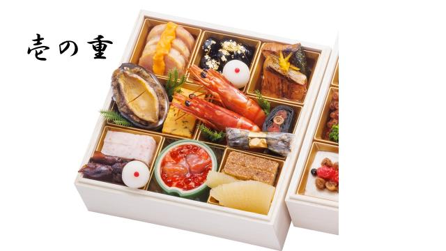 鰤照焼、きんぴらごぼう、黒豆金箔、鶏の燻製チーズソース掛け、ふくさ玉子、合鴨パストラミ、柚子餡餅、海老旨煮、鮑生姜煮、だし若布、田作りカシューナッツ和え、トリュフ入りレーズン松風、数の子醤油漬、鮭ルイベ漬いくら掛け、炙り烏賊の翡翠味噌掛け、ほたるいかしぐれ煮