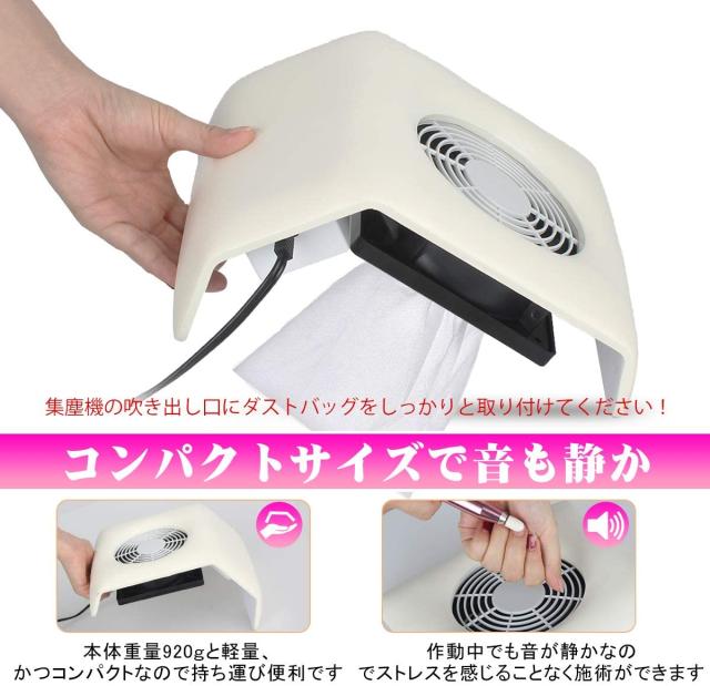 【使用と掃除簡単】付属品の集塵バックを本体に取り付けます。(吸引したダストは、袋に収集され、取付も簡単です)それで、ファンの穴の近くに手を置くだけで、爪の破片は簡単に吸収されます。