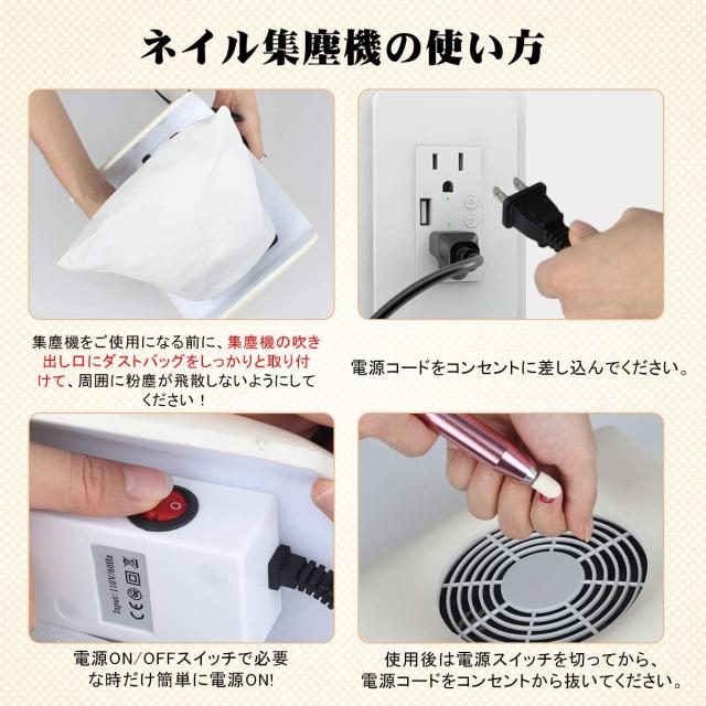 付属品の集塵バックを本体に取り付けます。(吸引したダストは、袋に収集され、取付も簡単です)それで、ファンの穴の近くに手を置くだけで、爪の破片は簡単に吸収されます。