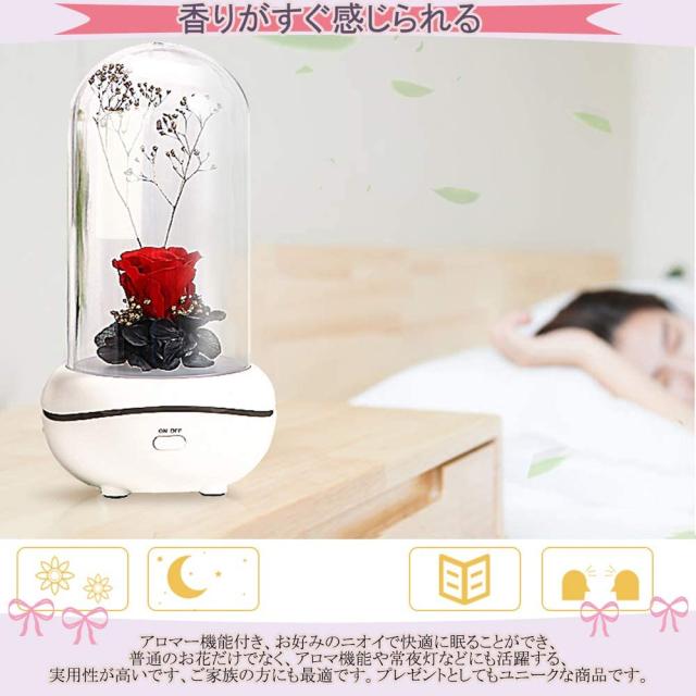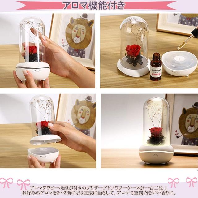 アロマ機能:ケース内のアロマ投入ホールにアロマを2、3滴たらすと、アロマ効果を発揮します。アロマテラピー機能が付きのプリザーブドフラワーケースが一台二役!アロマ使用上の注意:お好みのアロマを2〜3滴に限り直接に垂らして、アロマで空間内をいい香りに。過度にアロマを垂らした場合は、故障になる恐れがあるのでご注意ください。