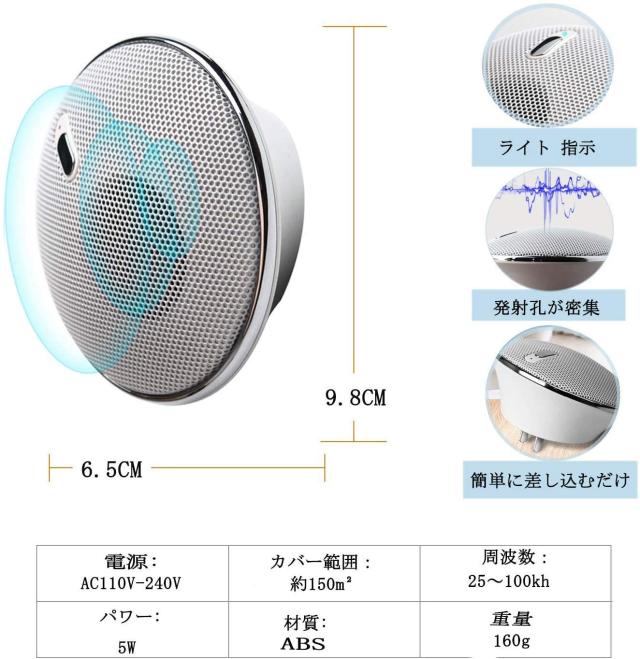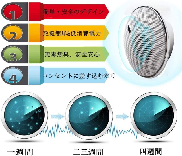 最初に、固定な超音波はネズミや害虫の正常生活を強く乱し、そして変化な頻度が20 KHZ〜100KHZの間に変化し続きます。そのため、ネズミや害虫などはだんだん適応出来なくなり、緊張で堪らなく、正常に飲食することが出来ません。一週間後くらい、やむをえず全て出かけられます。害虫を駆除出来るだけでなく、事前予防として、この製品を手に入れるのはオススメですよ。