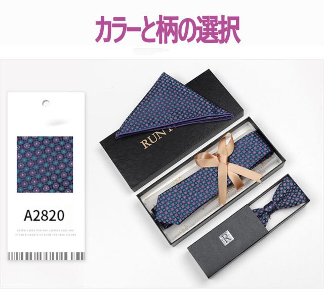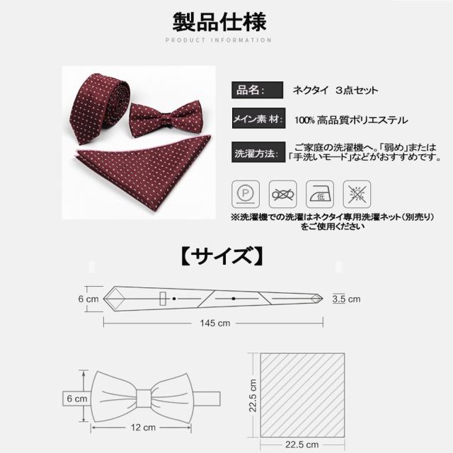 セット内容:ネクタイ+ハンカチ+蝶ネクタイ; 華やかな3点セットパーティーなどで不可欠である高級感のあるテトロンシルク 素材を使用したの合わせやすいなネクタイ 3点セットです。ベーシック且つトレンド性の高いデザインは季節を問わず、通年お使いいただけます。