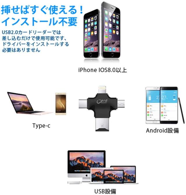 【兼用性】支持設備:iPhone8 plus/iPhone8/iPhone7 plus/iPhone7/iPhone 6s/iPhone 6s Plus/iPhone 6 Plus/iPhone 6/iPhone 5s/iPhone 5C/iPhone 5/iPad Air2/iPad mini2/iPad mini/iPad 4/iPod touch 5/iOS6/iOS7/iOS8/iOS9/iOS10/iOS11、Android、PC、などのAndroid Micro USB OTG機能を持つ機種とパソコンとMac/WindowsなどのUSB対応。