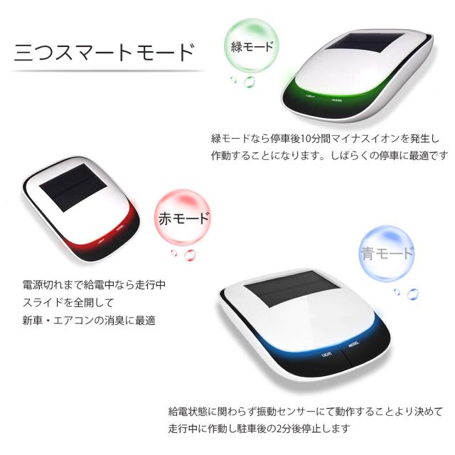 青いモードと同じ振動センサーにて動作し、緑モードなら停車後10分間マイナスイオンを発生し、作動することになります。しばらくの停車に最適です。