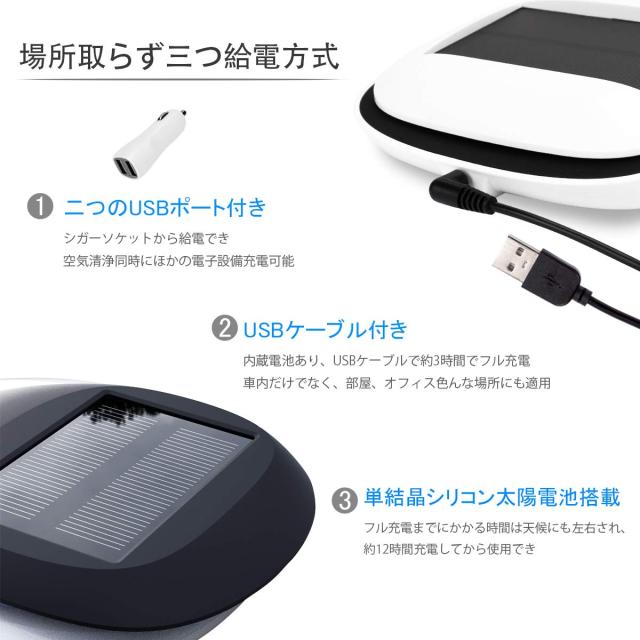 ソーラー充電12時間使用でき、二つの USBポートで空気清浄同時にほかの電子設備充電可能。フル充電までにかかる時間は天候にも左右されますが、約12時間です。フル充電の場合で、4時間使用することができます。