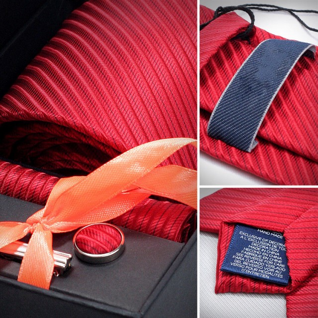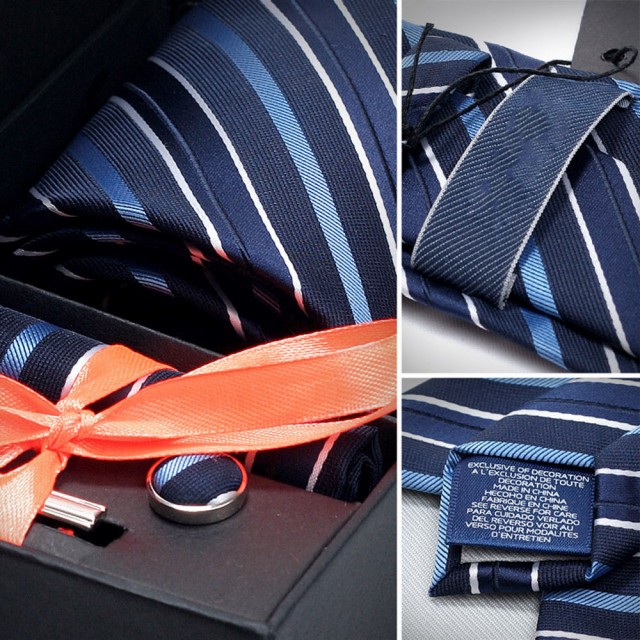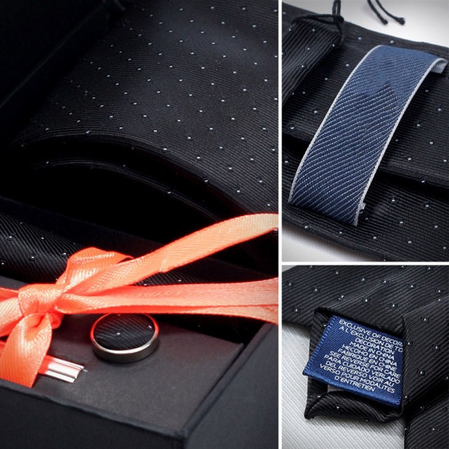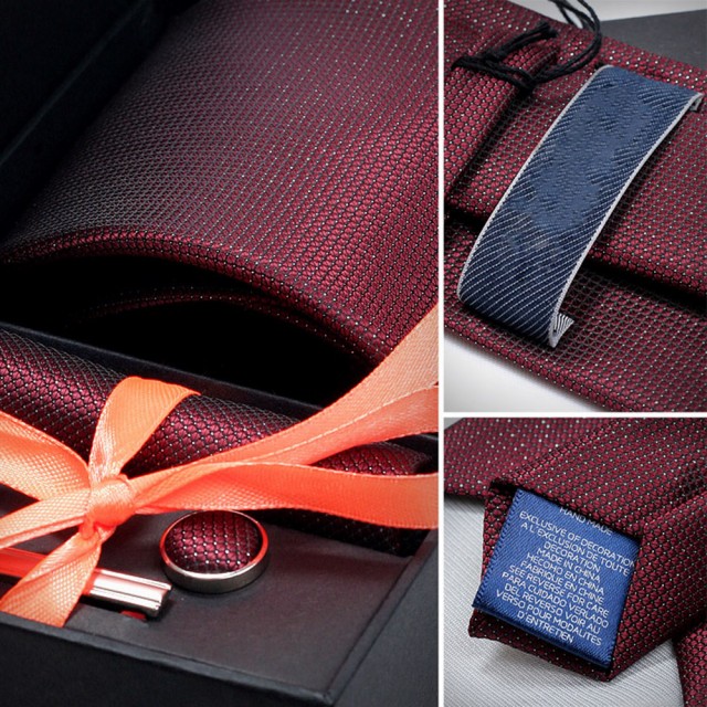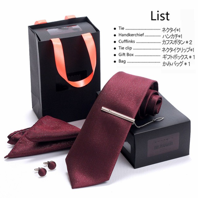 [メンズプレゼント4点セット] パッケージ内容:ネクタイ*1、ハンカチ*1、ネクタイクリップ*1、カフスボタン*2;高級感のあるシルク 素材を使用したの合わせやすいなネクタイ 4点セットです。ベーシック且つトレンド性の高いデザインは季節を問わず、通年お使いいただけます。