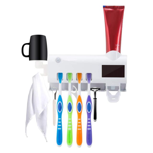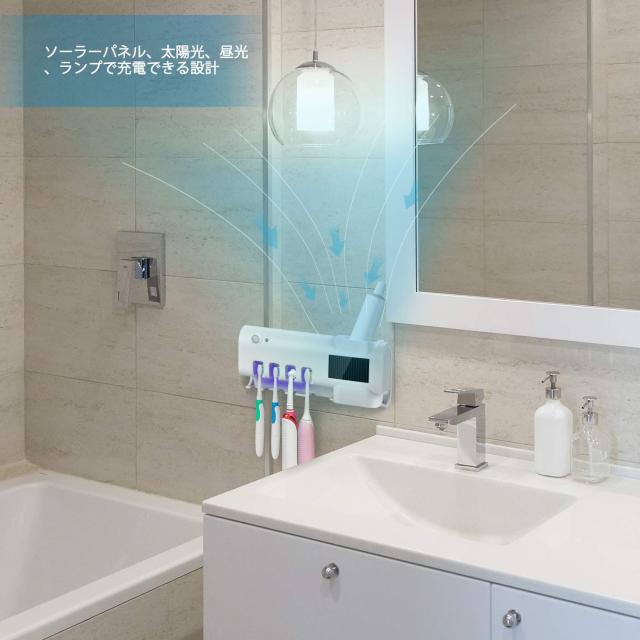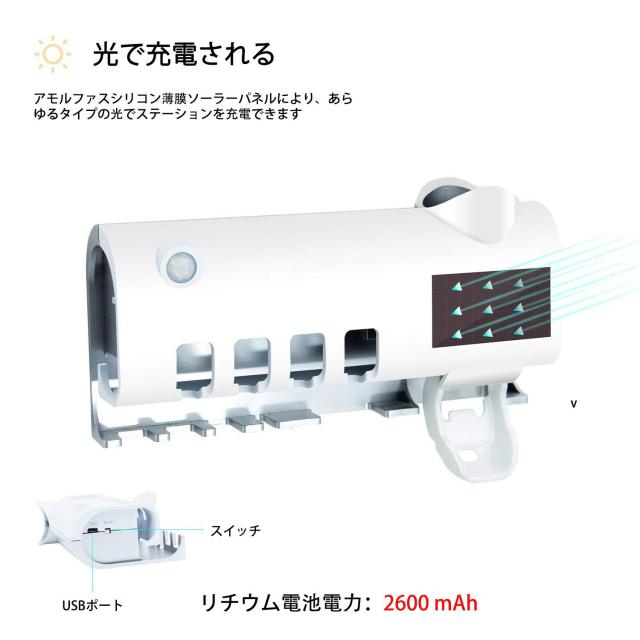 UV歯ブラシ除菌器 紫外線歯ブラシ消毒器 壁掛け歯ブラシスタンド 歯ブラシホルダー 歯磨き粉ホルダー ソーラー 練り歯磨きディスペンサー 太陽エネルギー充電 自動タイマー ダブル除菌 除菌率99.99% 熱感センサー 超強力3Mテープ付き
