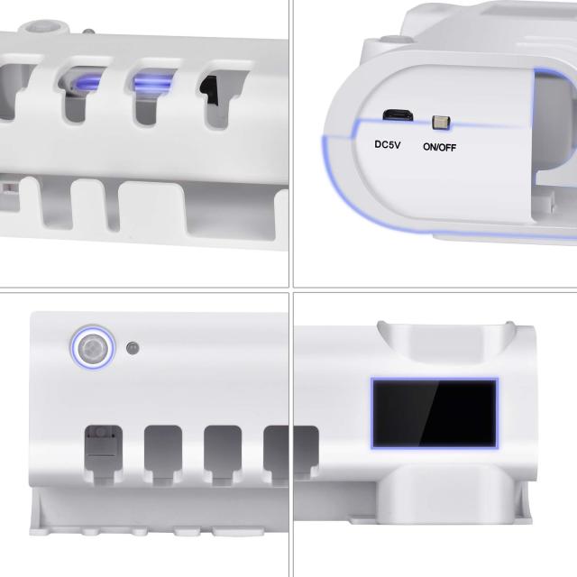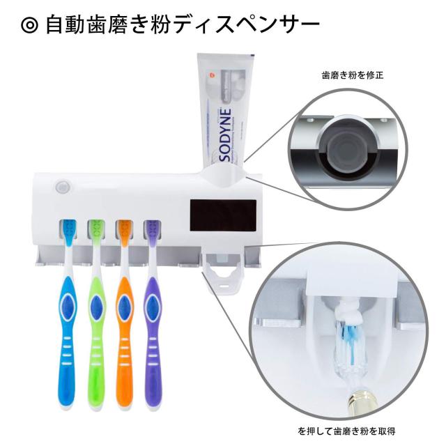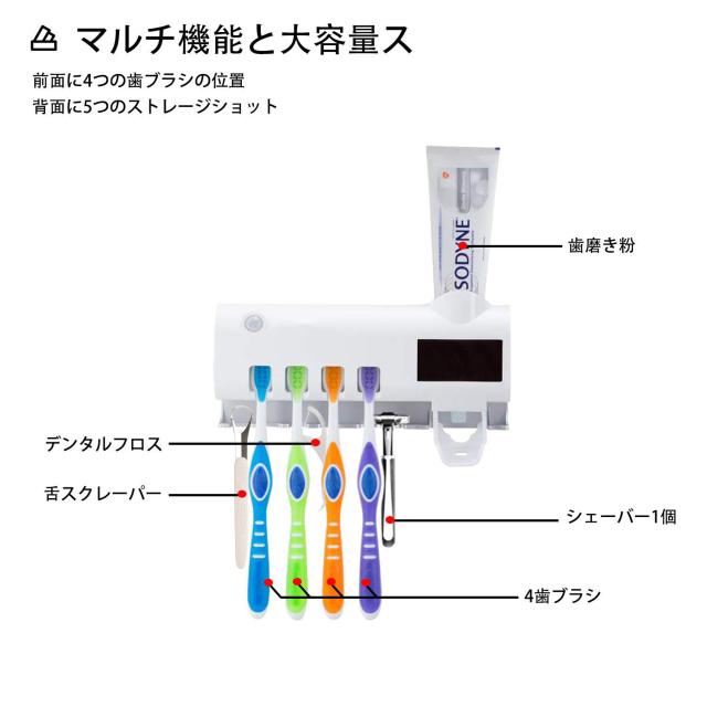 【多用途】:歯ブラシホルダーに練り歯磨きディスペンサーを付け、更に除菌できるようにしております。歯ブラシ(電動ハブラシも含む)を4本まで、カミソリ、デンタルフロス、練り歯磨き、コップ、タオルなどを一括にまとめられます。除菌してくれるので効率的に整理され、かつ衛生的です。