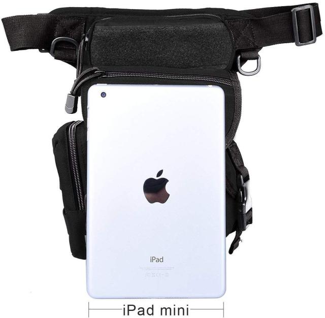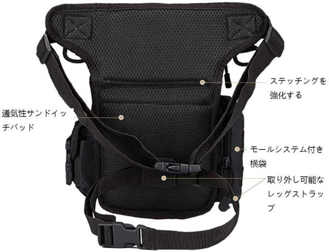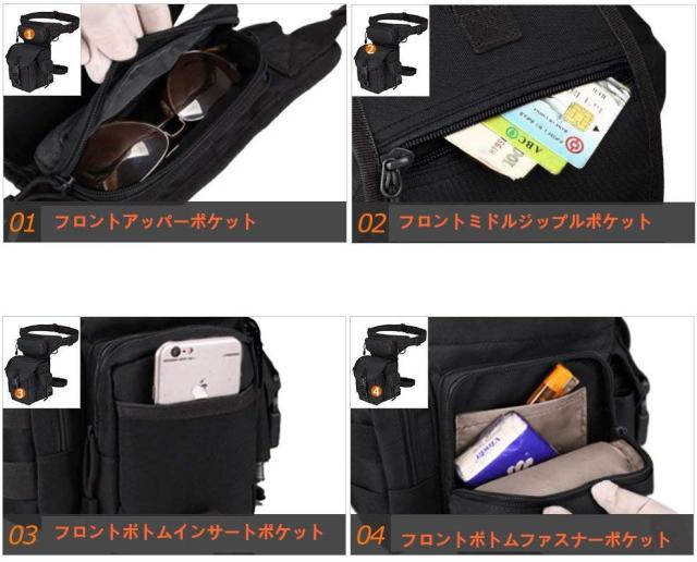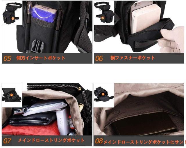 構造:カバーにチャック付き仕切りポケットが一つ。正面に仕切りポケットが一つ、ファスナーポケットが一つ。上部にファスナーポケットが一つ。右側にバックル式ポケットが一つ、左側にファスナーポケットが一つ。仕切り付きメインポケットが一つ。フロントポケットに携帯電話、スマホ、小銭、銀行カードなどが格納可能。両側ポケットにペン、ティシュー、鍵などが格納可能。上部ポケットはメガネに最適。メインポケットにiPad miniや7.9インチのタブレットPCが格納可能。腿と腰のベルト2点でしっかり固定ができる。腿のベルトを外すことが可能で、ウエストポーチ代わりの利用でもおしゃれで活躍!