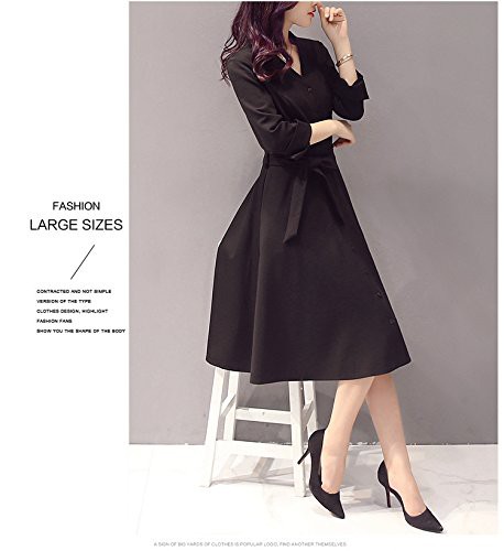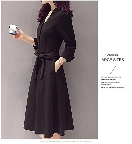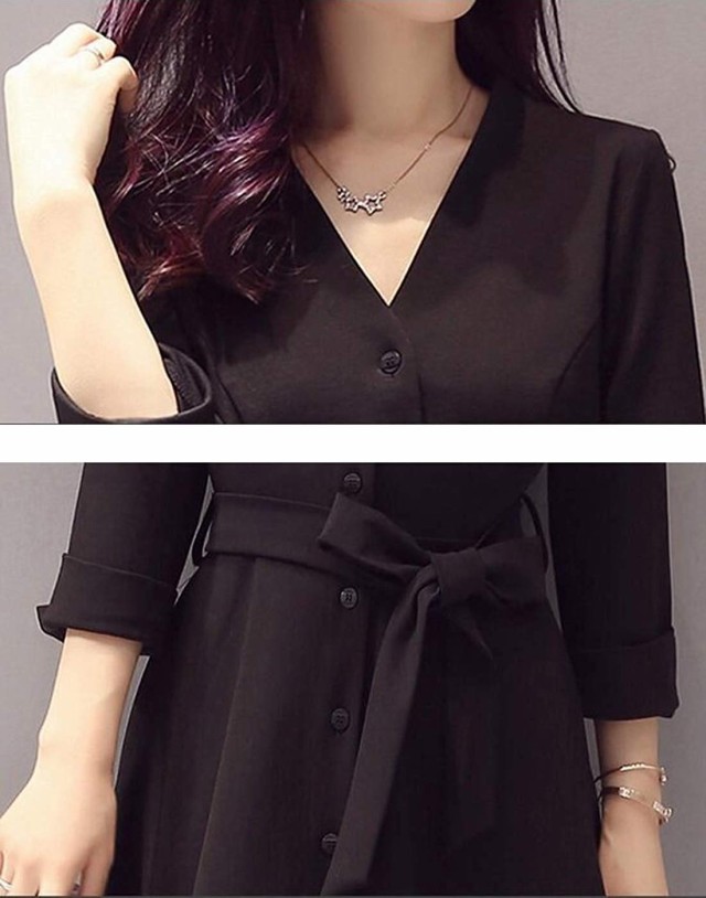 レディース ワンピース シャツワンピース チュニック 長袖 膝丈 秋冬 ドレス Vネック ひざ丈 無地 大きいサイズ ブラック 黒