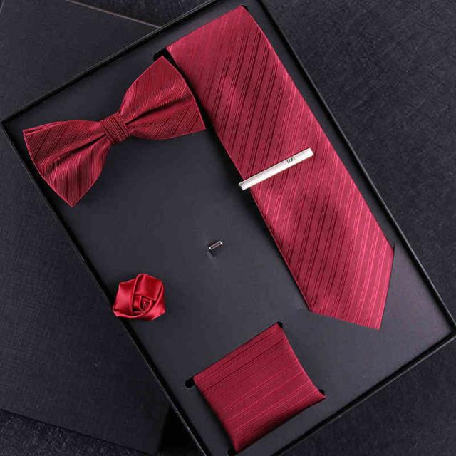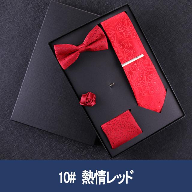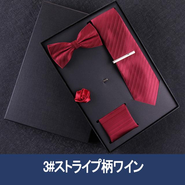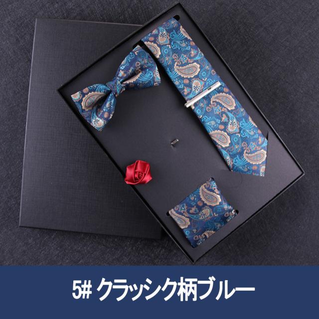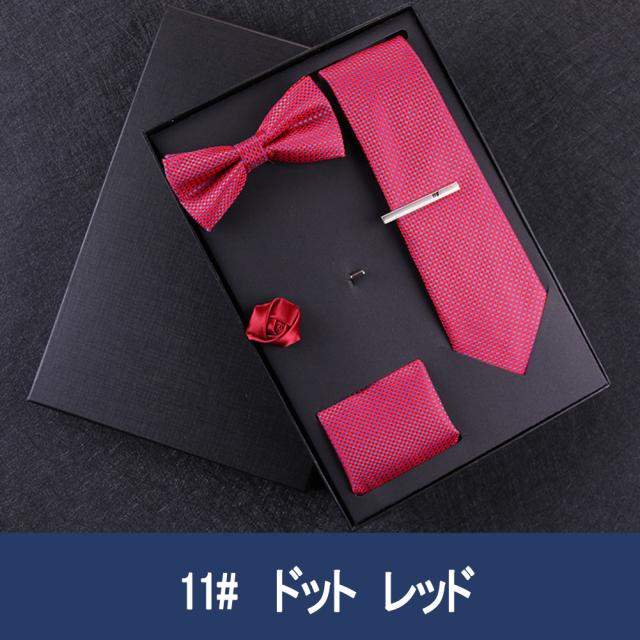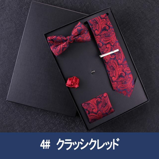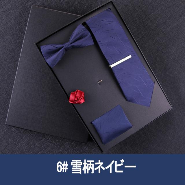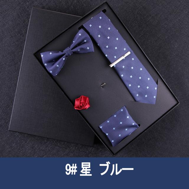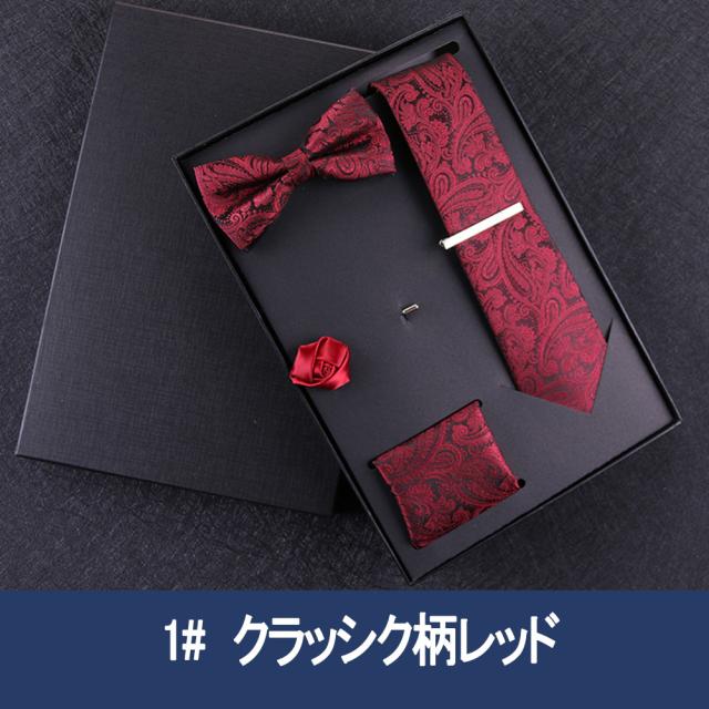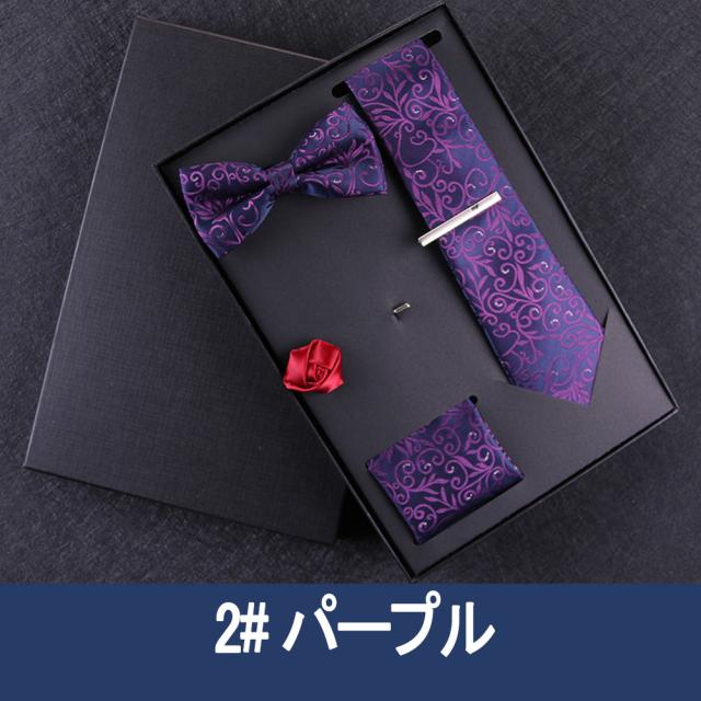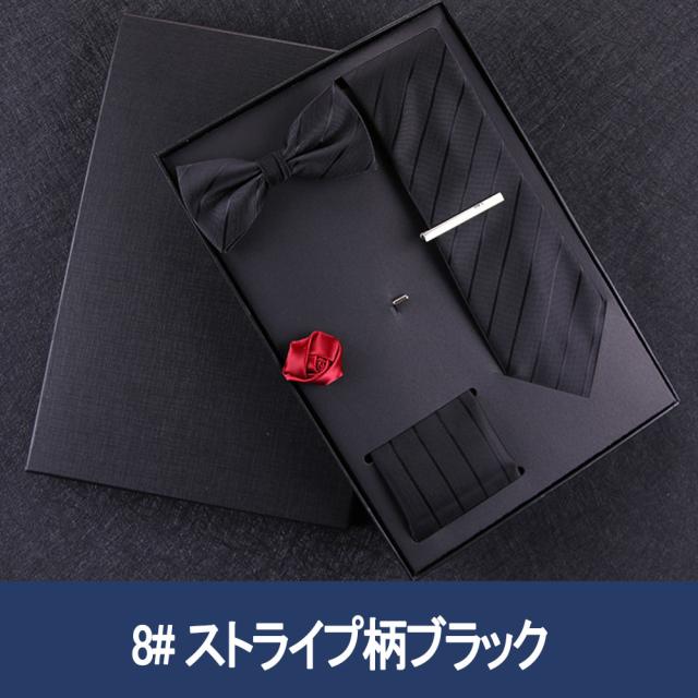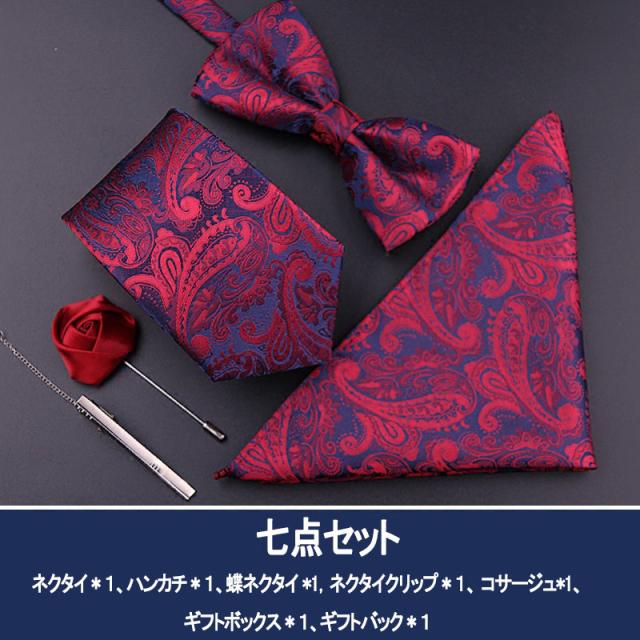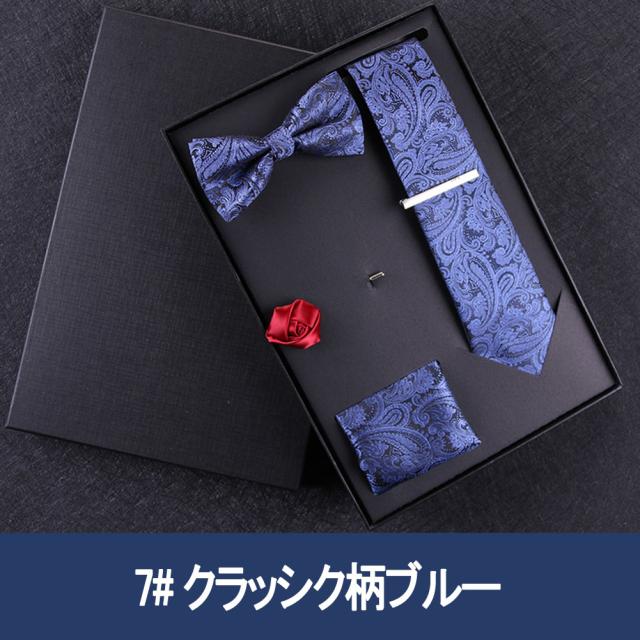 [メンズプレゼント7点セット] パッケージ内容:ネクタイ*1、ハンカチ*1、蝶ネクタイ*1、ネクタイクリップ*1、コルサージュ*1;ギフトボックス*1、ギフトバック*1;高級感のあるテトロンシルク 素材を使用したの合わせやすいなネクタイ 7点セットです。ベーシック且つトレンド性の高いデザインは季節を問わず、通年お使いいただけます。