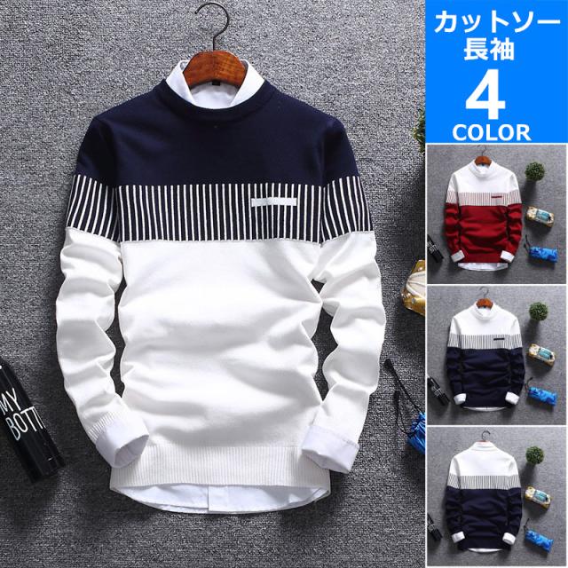 ニット セーター メンズ 春秋物 カットソー グールネック トップス 部屋着 細身 カジュアル 切替 スリム 長袖 お兄系 おしゃれ