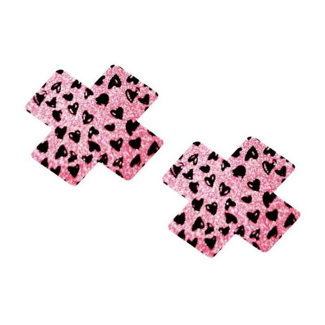 キラキラのピンク色の十字架クロスに黒色ブラックで小さなハートをいくつもデザインしたヒョウ柄のように見える大人可愛いニップルシール。