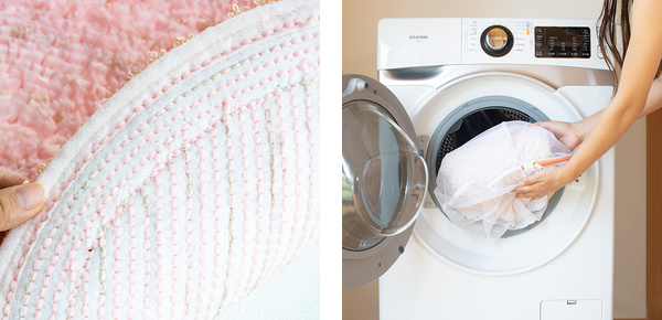 | 滑り止め付き マットの裏面にはすべり止め加工がされています。 | 洗濯機で丸洗いOK ネットに入れて洗濯機で丸洗いできます。気軽に洗濯できて清潔です。 |