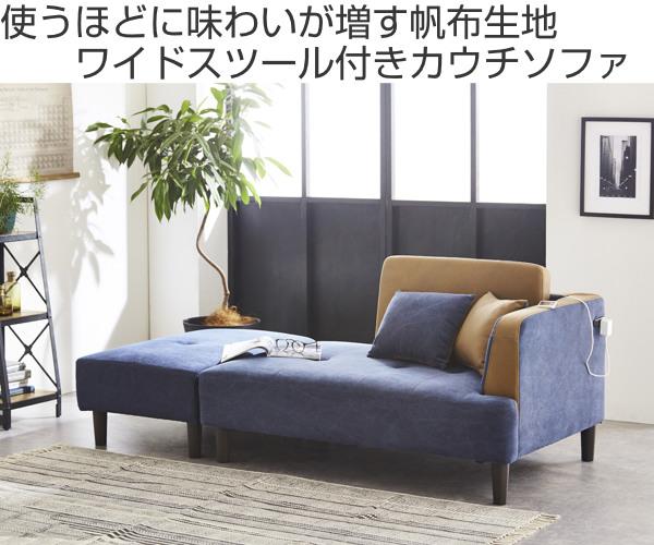 カウチソファ 2点セット 帆布生地 ワイドスツール コンセント 脚付き ファブリック ( ソファ オットマン ソファー ローソファ フロアソファ コンパクト クッション 収納 ポケット 脚 取り外し ソファベッド おしゃれ )