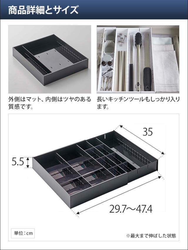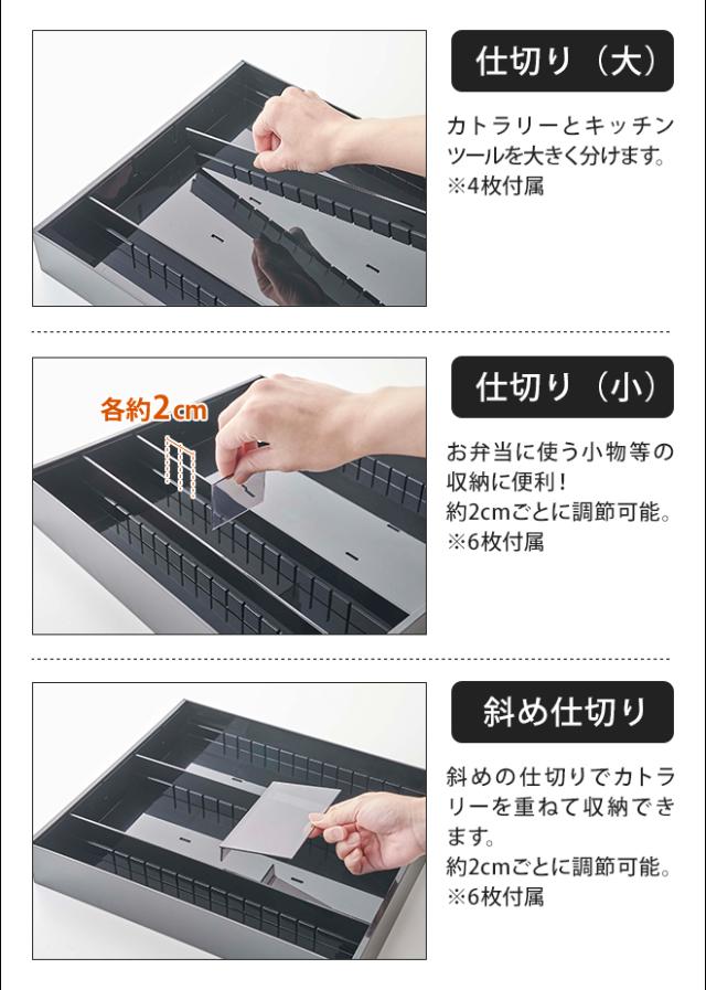 伸縮できるだけでなく、3種の仕切りは移動可能だから、自分好みにカスタマイズできます!