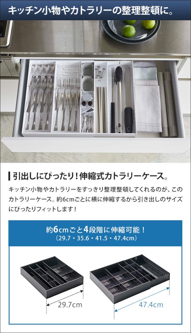 こちらの立体横伸縮カトラリーケースは、横に約6cmごとに4段階に伸縮可能だから、設置する引き出しのサイズにぴったりフィットします!