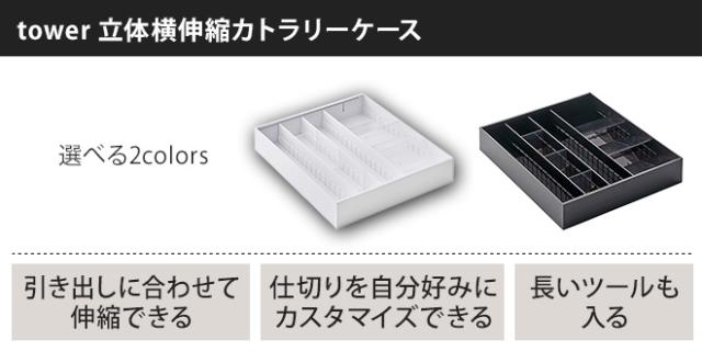 山崎実業 カトラリーケース カトラリートレー 仕切り オシャレ ラック 箸入れ 洗える おすすめ スリム 調節 ぴったり カトラリー収納 キッチン収納 小物収納 食器棚 引き出し 収納 yamazaki タワーシリーズ tower タワー 立体横伸縮カトラリーケース 5415 5416 4903208054157 4903208054164 整理用品 スライド キッチンツール 箸 整理 シンプル おしゃれ モノトーン ホワイト ブラック カスタマイズ 整理整頓 重ねて収納 調理器具
