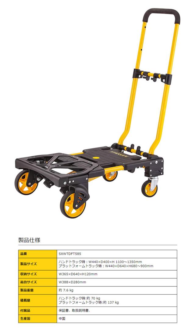 ■商品名:STANLEY 台車 折り畳み式 2WAY台車 運搬台車 ハンドトラック プラットフォームトラック 折りたたみ 折畳 ハンドトラック時70kg プラットフォームトラック時137kg