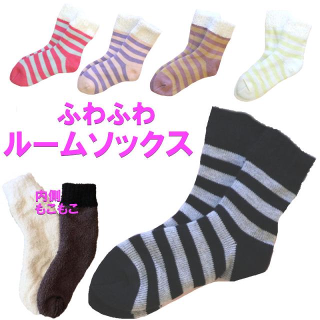 裏ボア レディース 靴下 ボーダー もこもこ ふわふわ ルームソックス やわらかく優しい肌触り 暖かい 冷え取り 室内履き スリッパ くつ下 あったか靴下 メール便 送料無料 二重編み 保温 マシュマロタッチ ルームウェア 防寒 冷え性 節電 e89