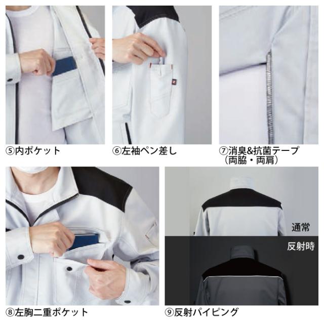 ◇機能:背ネーム、携帯電話収納ポケット、内ポケット、消臭&抗菌テープ(両脇・両肩)、反射パイピング、ウイングアーム?U、アクションプリーツ、左袖ペン差し、左胸二重ポケット、樹脂ファスナー(フロント、ポケット)、樹脂ボタン