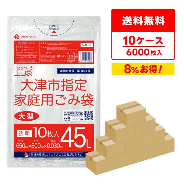 【まとめて10ケース】SOT-45-10 大津市指定袋 家庭用ごみ袋 45リットル 大型 0.030mm厚 透明 10枚x60冊x10箱/ ゴミ袋 ごみ袋 送料無料