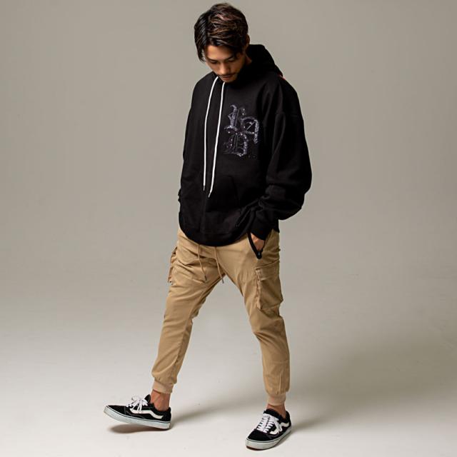 股上を深めに設定し、腰から太もも周りにややゆとりを持たせたサルエル感を演出。