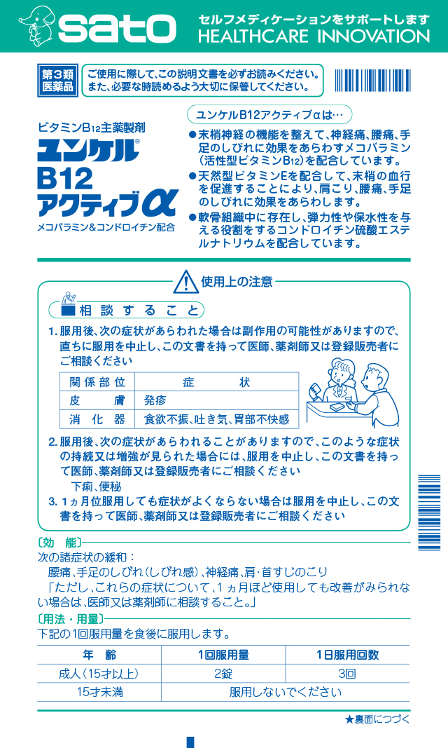 第3類医薬品 ユンケルB12アクティブα120錠 セルフメディケーション税制対象商品 佐藤製薬 つらい腰痛 神経痛 しびれ感 肩 首すじのこり