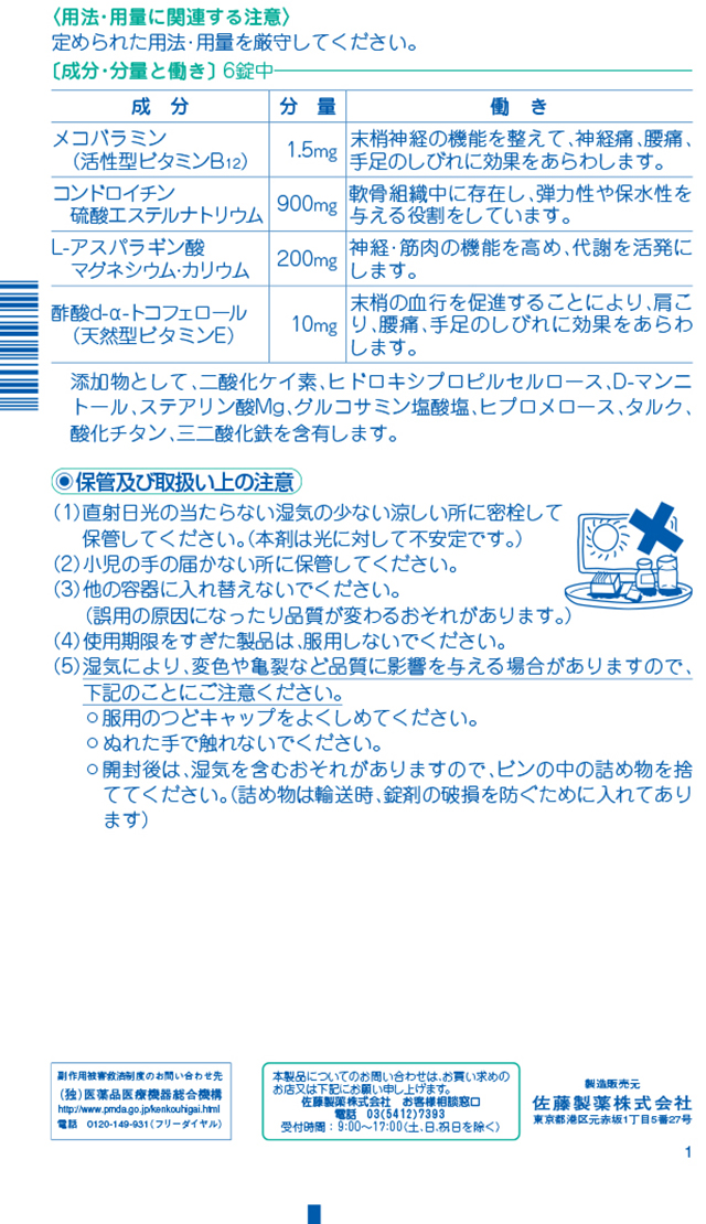 つらい腰痛、神経痛、しびれ感、肩・首すじのこりに末梢神経の機能を整えて、神経痛、腰痛、手足のしびれに効果をあらわすメコバラミン(活性型ビタミンB12)を配合しています。