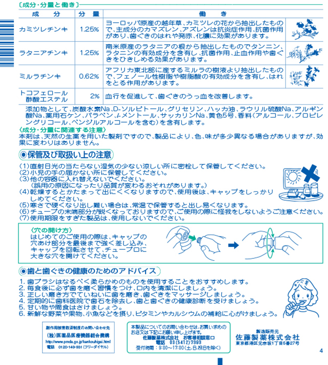 商品名 第3類医薬品 アセスE130g 佐藤製薬 容量 130g JANコード 4987316003672 メーカー 佐藤製薬 カテゴリー 医療・介護・医薬品>医薬品>口中の薬>口中の薬【第三類医薬品】 効果・効能 歯肉炎・歯槽膿漏の諸症状(口のねばり・歯ぐきのむずがゆさ・はれ・発赤・歯ぐきからのうみ・出血・口臭)の緩和。 用法・用量 適量(1.0g、約3cm)を歯ブラシにつけて、1日2回(朝・夕)歯肉をマッサージするように磨きます。 セルフメディケーション税制対象 対象外 区分 第三類医薬品