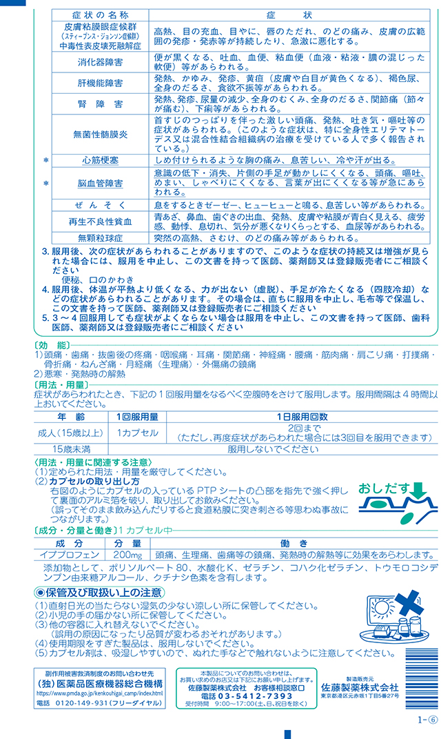商品名 指定第2類医薬品 リングルアイビーα200 36CP 佐藤製薬 ※セルフメディケーション税制対象商品 容量 36CP JANコード 4987316032931 メーカー 佐藤製薬 カテゴリー 医療・介護・医薬品>医薬品>頭痛・痛み止め>頭痛・痛み止め【第一・二類医薬品(指定第二医薬品含む)】 効果・効能 頭痛・歯痛・抜歯後の疼痛・咽喉痛・耳痛・関節痛・神経痛・腰痛・筋肉痛・肩こり痛・打撲痛・骨折痛・ねんざ痛・月経痛(生理痛)・外傷痛の鎮痛 ・悪寒・発熱時の解熱 用法・用量 成人(15歳以上)1回1カプセル、1日2回を限度とします。(ただし、再度症状があらわれた場合には3回目を服用できます)1回服用量をなるべく空腹時をさけて服用します。服用間隔は4時間以上おいてください。 ※15歳未満は、服用しないでください。 セルフメディケーション税制対象 対象 区分 指定第二類医薬品